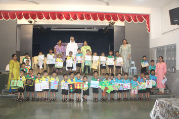 All the children came to school wearing green colour dress. They learned about the colour green and the things in nature that are green, like vegetables, leaves, and frogs. The classrooms were decorated with charts, drawings, and paintings made collectively by the teachers and students. The board outside too was decorated with all things green.